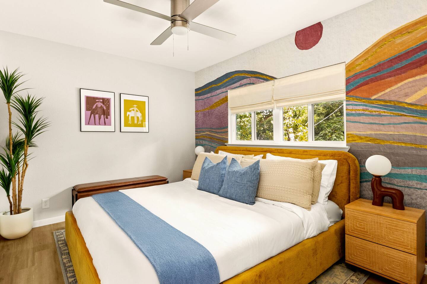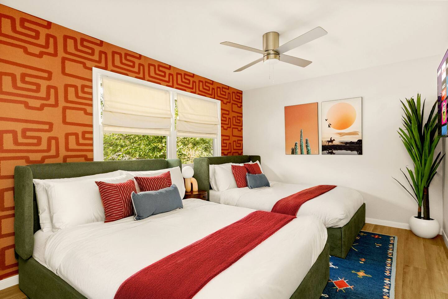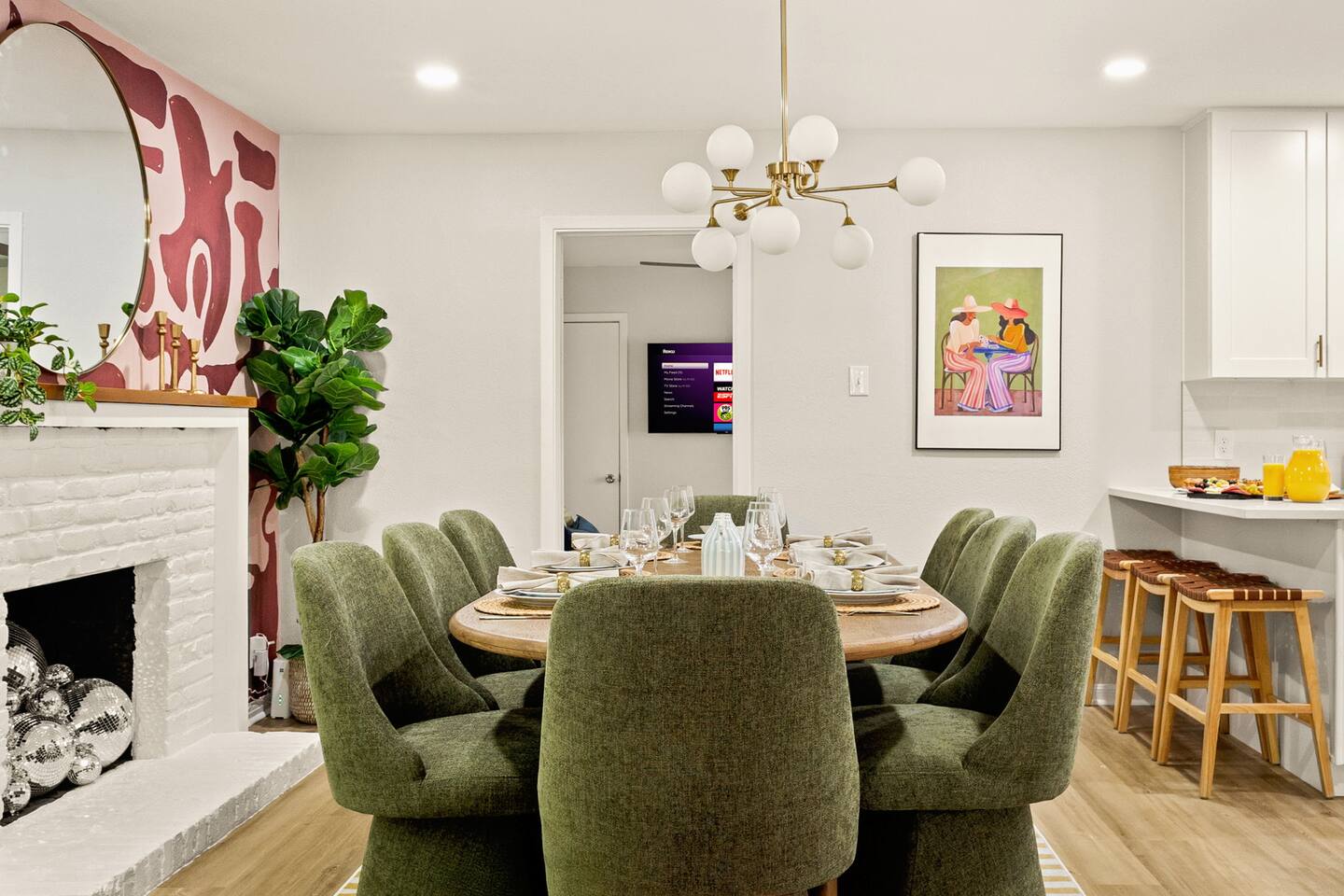 Centrally located in South Congress (SoCo), our 4 bed / 3 bath retreat comfortably sleeps 14 and is packed with thoughtful amenities for an unforgettable Austin experience! LUXURY RESORT-STYLE BACKYARD: ☀ Heated pool for year-round swims ☀ Covered hot tub lounge with outdoor TV ☀ Cozy string-lit fire pit ☀ Mini golf for some friendly competition! ☀ Full-size ping pong table ☀ Large outdoor dining table + grill ☀ Plenty of outdoor seating ☀ Yoga mats & yard games! PRIVATE MOVIE THEATER ROOM: ☀ 100-inch screen with 4k projector ☀ Immersive surround sound system ☀ Popcorn machine for movie night vibes ☀ Get-ready station with light-up mirrors! ☀ Retro arcade games ☀ Oversized sofa with pull-out queen sleeper FIRST FLOOR COMFORTS: ☀ Open concept living & dining ☀ Fully stocked kitchen w/ stainless steel appliances ☀ Premium coffee station for your morning kick! ☀ King bedroom w/ ensuite bath + workspace ☀ Laundry room with washer & dryer SECOND FLOOR DREAMING: ☀ Double queen bedroom w/ ensuite bath + glam station! ☀ 2nd king bedroom ☀ Additional double queen bedroom ☀ Full hallway bathroom CLOSE TO EVERYTHING: » Downtown Austin → 10 min » South Congress (SoCo) → 6 min » Zilker Park (ACL) → 14 min » Rainey Street → 12 min » State Capitol → 16 min » UT Football → 18 min » Austin Convention Center → 17 min » The Domain → 25 min » Lake Travis → 35 min » Austin-Bergstrom Airport → 11 min Whether you’re lounging poolside, toasting under string lights, or getting ready for a night on the town, Sunset Social is where your Austin memories shine brightest. Designed with group getaways in mind, this home mixes resort-style fun with cozy cowboy touches—the perfect backdrop for a weekend with your favorite people in ATX.
